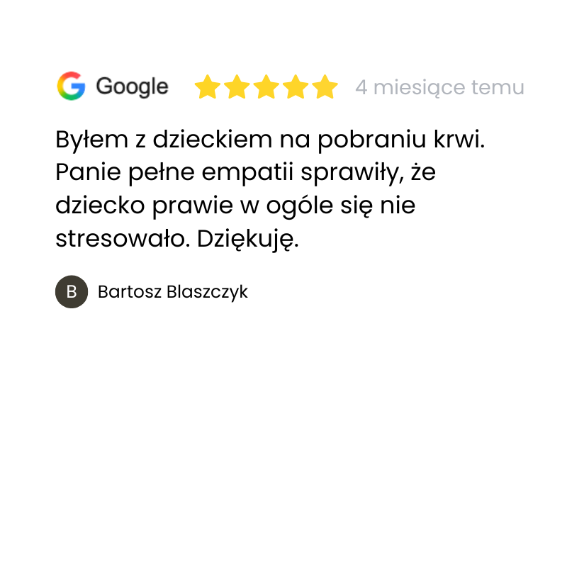 Odbiór wyników możliwy jest następnego dnia po godzinie 12:00 chyba, że laboratorium poda inny termin odbioru badań.